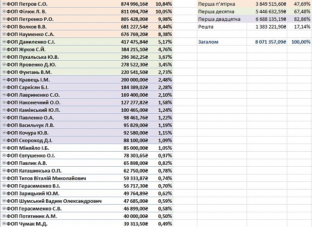 Пропонуємо до вашої уваги ТОП 30 ФОП-ів які отримали найбільше коштів з бюджету громади у 2018 році. З ВОСЬМИ мільйонів, які було перераховано ФОП-ам, перша п'ятірка отримала майже половину, а перша двадцятка – майже все, це при тому, що загальна кількість ФОП-ів була більше сотні. Коментарі тут, здається, зайві. Найбільша частина "пирога" вже не перший рік достається кишеньковим депутатам та друзям голови.